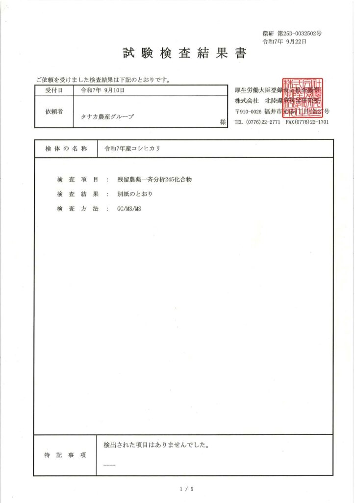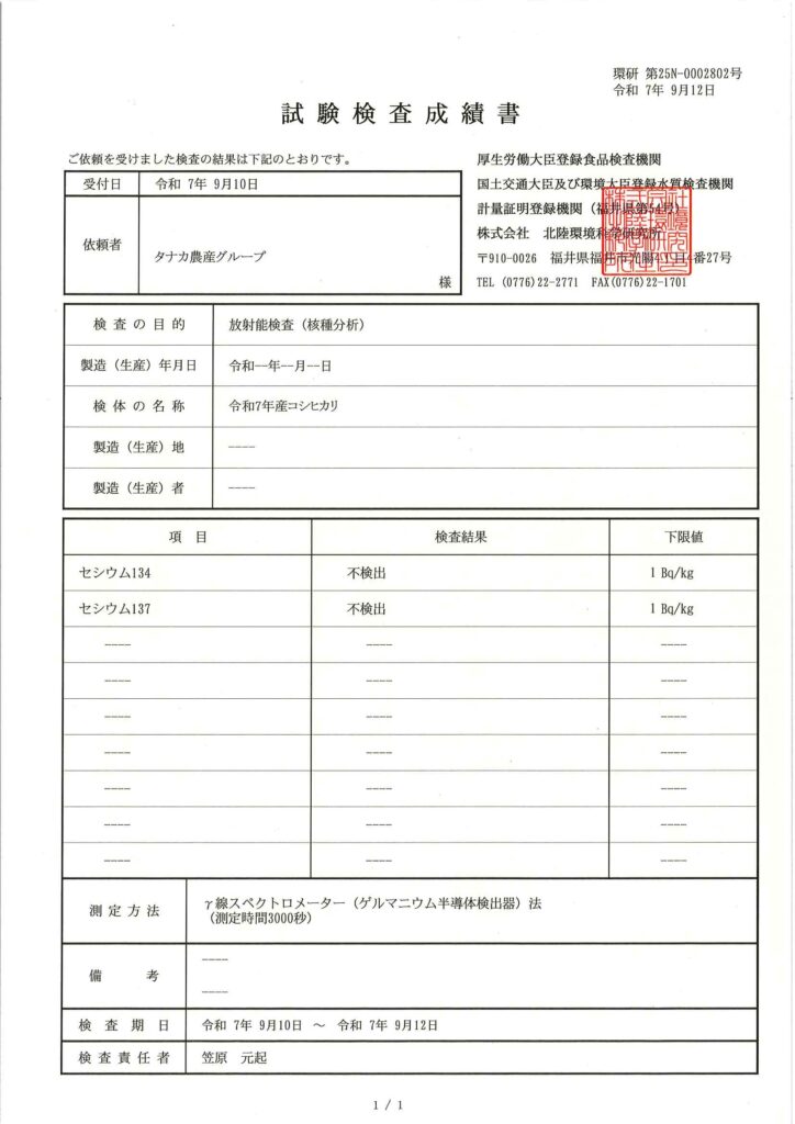 タナカ農産グループでは、皆様に安心してお米を召し上がっていただくために、毎年自主的な検査を行っております。